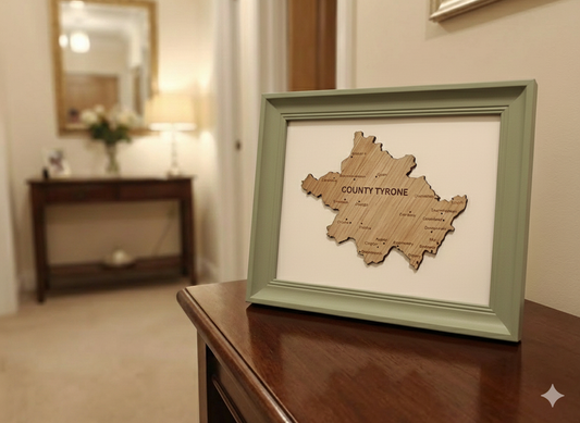 "The O'Neill County" Engraved Wooden Map of Tyrone | Custom Framed Heritage Art in Brown or Sage Green | Personalised Irish Roots Gift