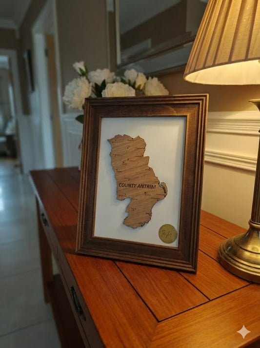 "The Glens & The Causeway" County Antrim Engraved Wooden Map | 3D Heritage Art in Sage Green or Classic Brown Frame | Personalised North Coast Roots Gift